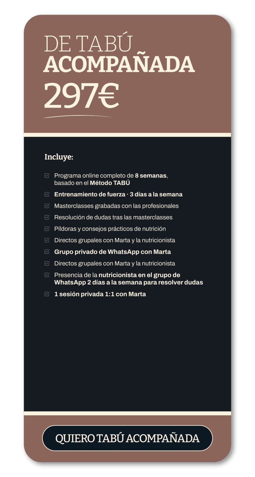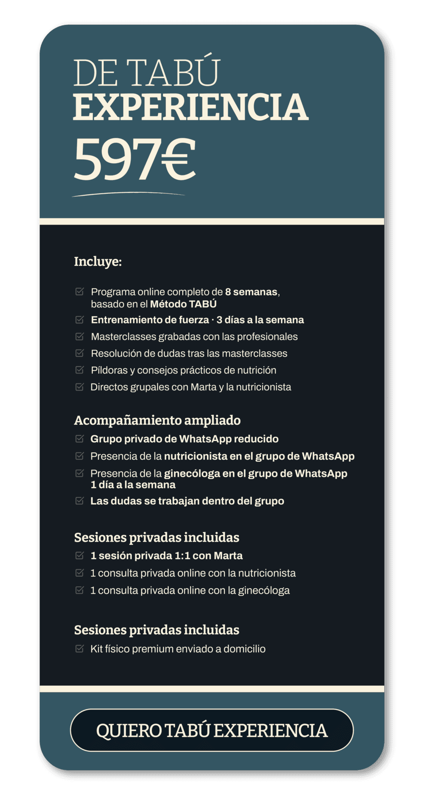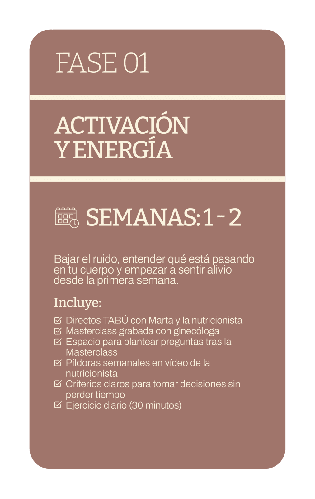Un programa online de 8 semanas, basado en el método T.A.B.U, pensado para mujeres a partir de los 40 que quieren entender qué les pasa, recuperar energía y tomar decisiones con criterio en esta etapa.